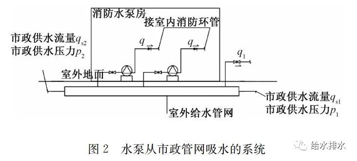 根據“消水規”5.1.12條第2款,消火栓泵可以從市政管網(wǎng)吸水,如圖2。工程中也大量存在這類(lèi)系統,比如一些地鐵站房的消火栓臨時(shí)高壓系統,有些地方的多層消火栓臨時(shí)高壓系統。這類(lèi)系統平時(shí)準工作狀態(tài)的壓力由市政水壓保持,沒(méi)有穩壓泵。