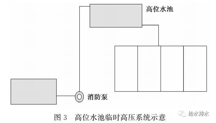 “消水規”4.3.11條第3、4款規定,除可一路消防供水的建筑物外,向高位消防水池供水的給水管不應少于2條;當高層民用建筑采用高位消防水池供水的高壓消防給水系統時(shí),高位消防水池儲存室內消防用水量確有困難,但火災時(shí)補水可靠時(shí),其總有效容積不應小于室內消防用水量的 50%。以此為依據,臨時(shí)高壓系統的消火栓泵可向高位水池供水,然后再由該水池向消火栓配水管網(wǎng)重力供水,如圖3。此類(lèi)系統在超高層建筑中比較常見(jiàn)。