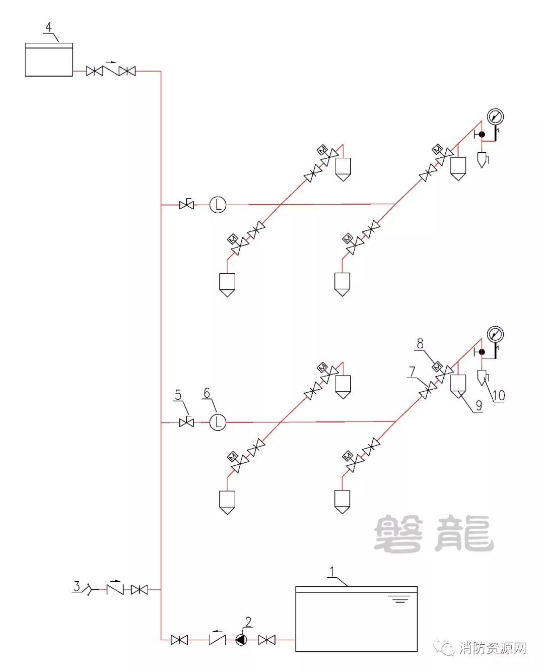 自動(dòng)跟蹤定位射流滅火系統的滅火及消防供液,主要包括:1、消防水池;2、消防水泵;3、水泵接合器;4、高位消防水箱;5、信號閥;6、水流指示器;7、檢修閥(信號閥或帶鎖止裝置的控制閥);8、電磁閥(或電動(dòng)閥);9、射流裝置(或消防炮);10、末端試水裝置;