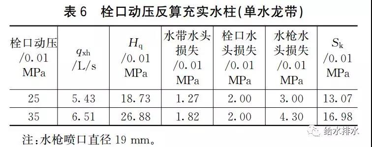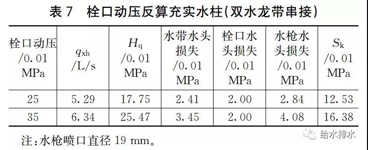 顯然表6單水龍帶的計算值大于表7。假設允許雙水龍帶串接并且疊加水槍水頭損失時(shí),表7中充實(shí)水柱計算值仍然遠遠高于規范規定的10 m和13 m。對于栓口動(dòng)壓與充實(shí)水柱的差異,“水消規”7.4.12條的條文解釋為“計算得到消火栓栓口壓力Hxh為0.251 MPa,考慮到其他因素規定消火栓栓口動(dòng)壓不得低于0.35 MPa”,究竟是哪些其他因素需要將壓力提高40%并未詳細說(shuō)明。