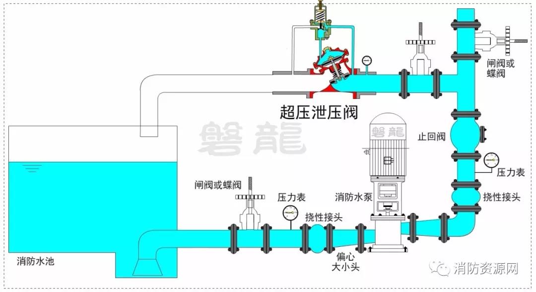系統超壓很可能發(fā)生在流量測試或系統試水的情況中,因此,超壓泄壓閥接口宜與流量測試、系統試水等處于同一閥門(mén)控制管段。