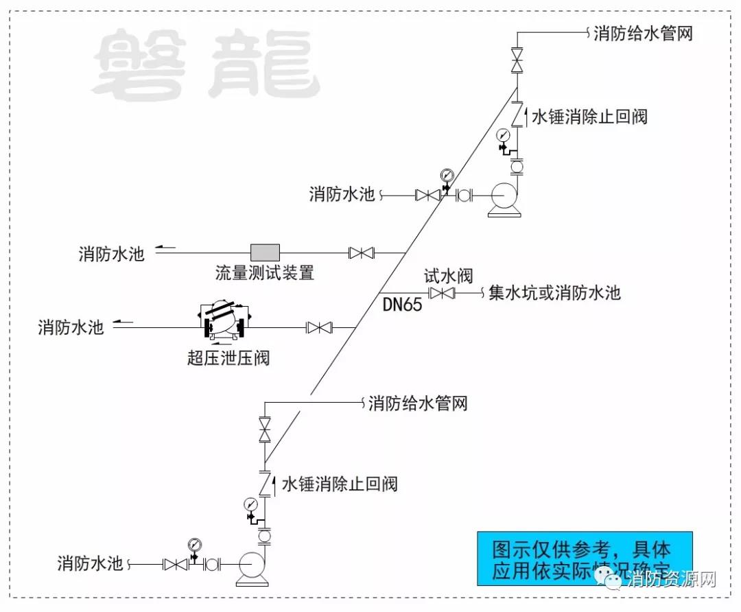 3、說(shuō)明:本示例的泄壓閥、試水閥和流量測試裝置等排水,均回流到消防水池中。為防止對消防水池的污染,實(shí)際應用中,建議設置旁通管路,將少量的排水直接排向泵房集水坑。