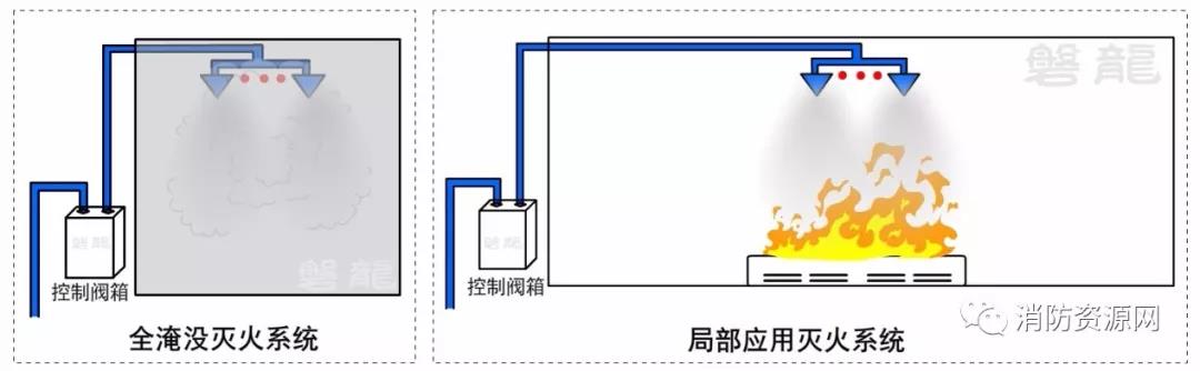 3、局部應用滅火系統主要是針對固定的對象進(jìn)行保護,沒(méi)有防護區的概念,可以應用在開(kāi)敞的空間。